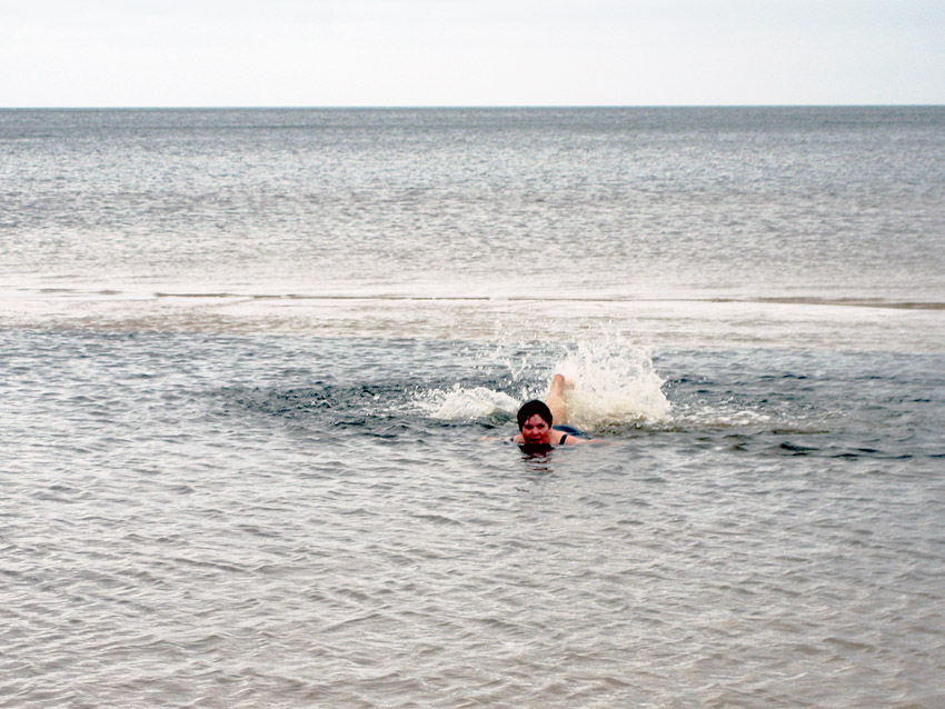 Eeva pulikoimassa Laatokan hyisessä vedessä