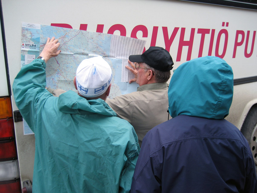 Osmo, Antero ja Leena toteavat kartalta — missä tuli käytyä