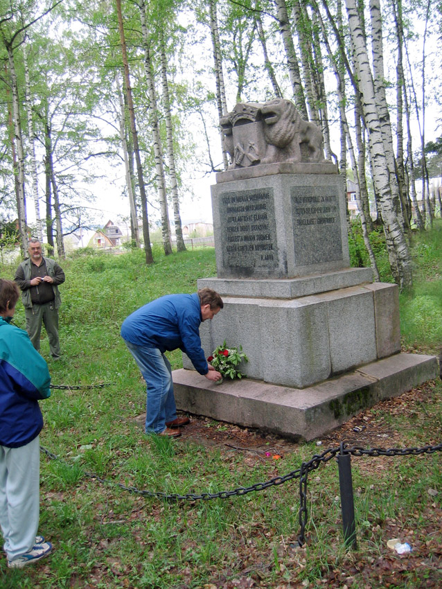 Kari laskee kukat Sakkolan sankarivainajien muistomerkille